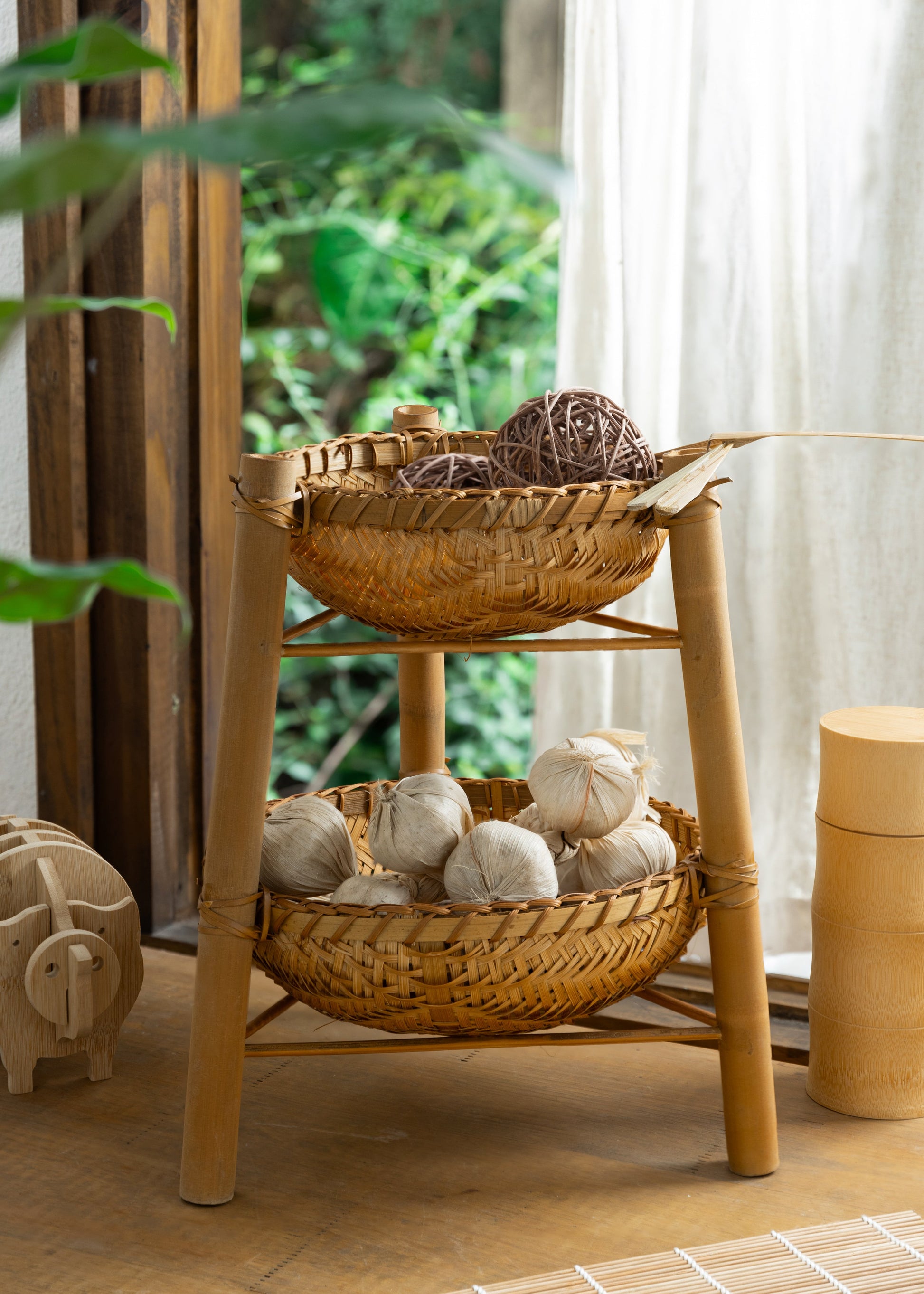 Made from bamboo, its two rounded baskets rest on a sturdy bamboo frame—perfect for storing fruits, garlic, herbs, or simply adding a functional rustic touch to your kitchen or living room. Lightweight, breathable, and naturally beautiful, it blends in effortlessly with any cozy, minimalist home.