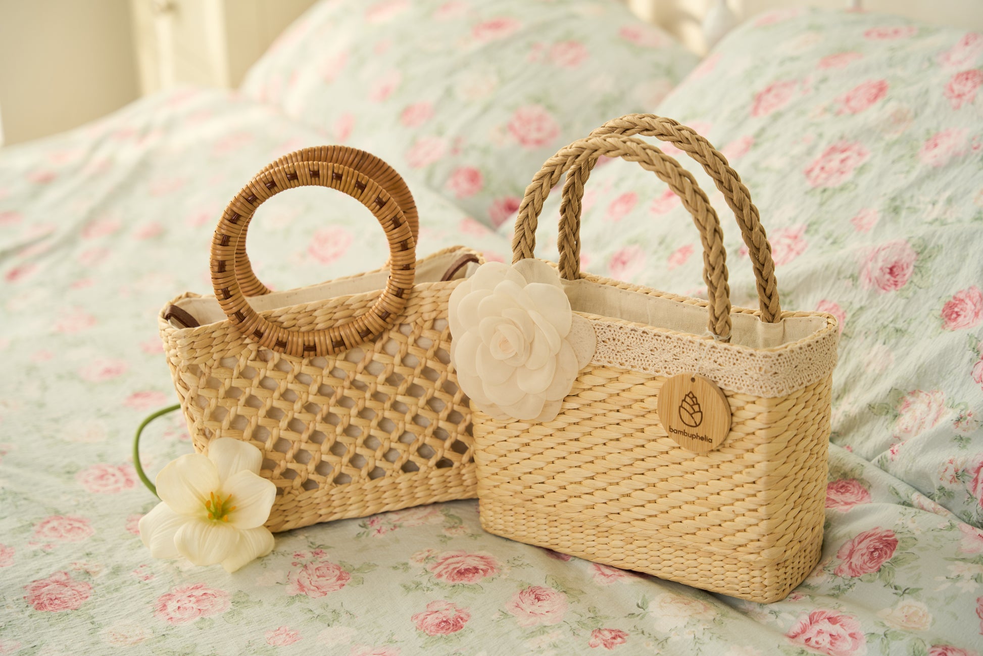 Crafted entirely by hand from sustainable rattan, this handbag is adorned with braided handles and lace edging for subtle charm. Finished with a soft chiffon flower detail, it adds a dreamy and feminine accent to your ensemble while staying practical and versatile for daily use.