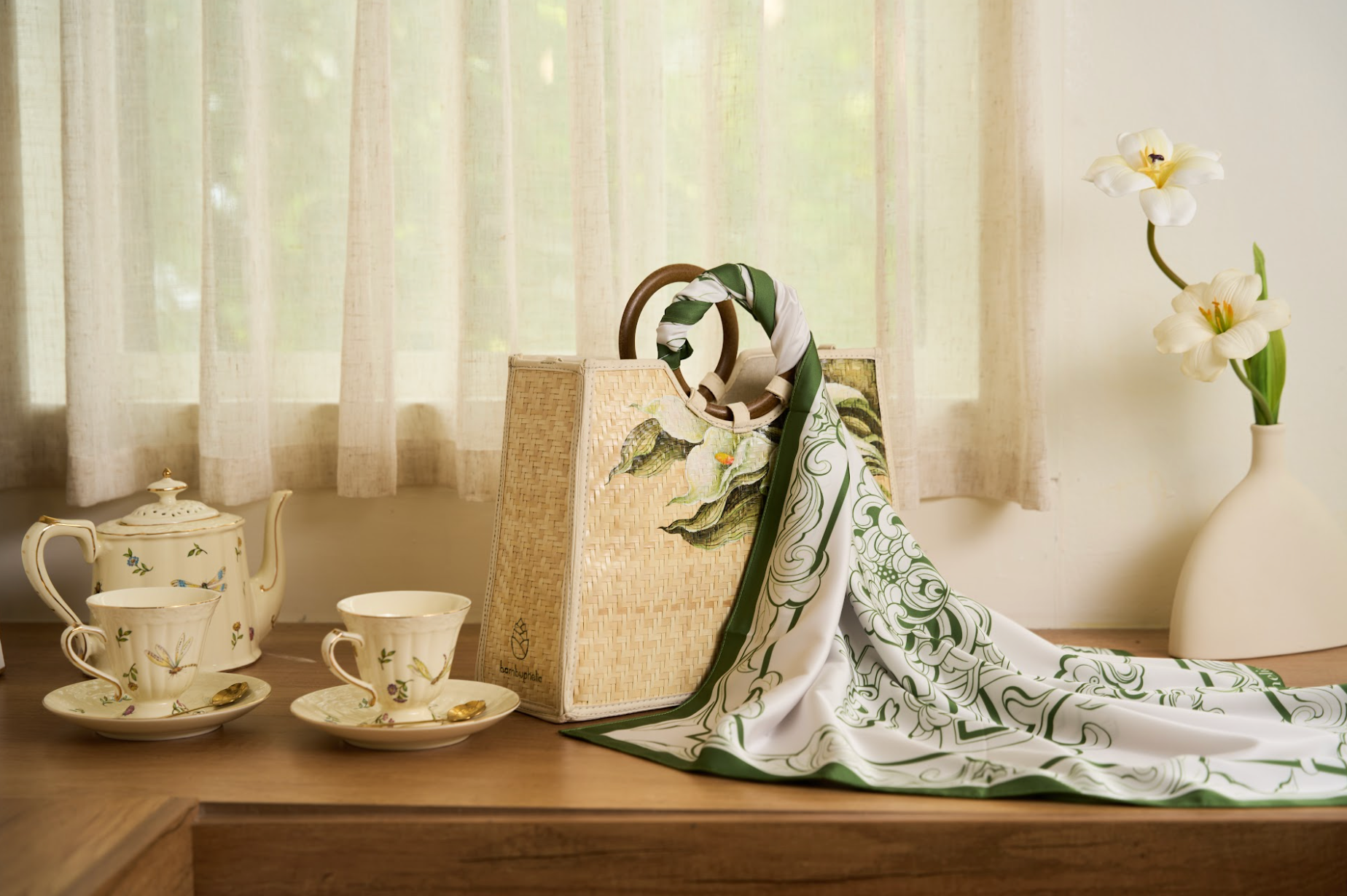 To complete the look, the bag comes with a soft Bambuphelia silk scarf tied to the handle.